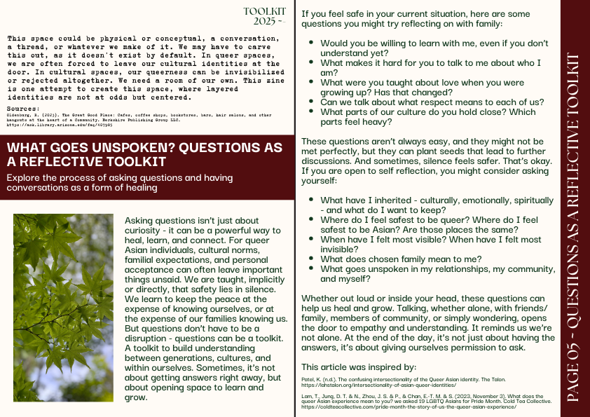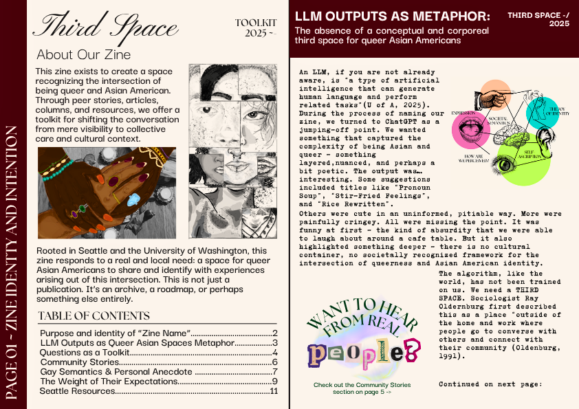 For INFO 352: Race, Gender, and Information, my group created Third Space, a zine that explores the intersection of being queer and Asian - two identities I personally hold and have often struggled to navigate within the same space. Throughout the course, we examined how identity shapes access to information and safe spaces, and I wanted our final project to move beyond theory and reflect a lived experience that is frequently overlooked and left unspoken.